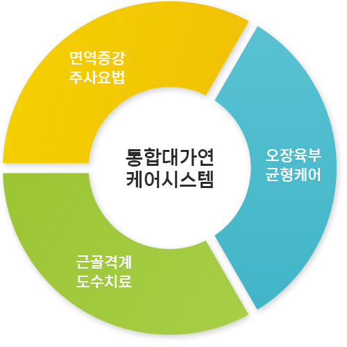 - 30년 이상 원장님의 암치료 경험과 노하우를 바탕으로 한 치료로서, 음양오행의 원리에 근거하여 장기의 불균형을 교정하고 장부의 소통을 원활하게 도와줍니다. 특히 다발성 암, 전이암, 재발암, 근골격계 질환을 고통 없이 호전시키는 성과를 보이는 치료법입니다.