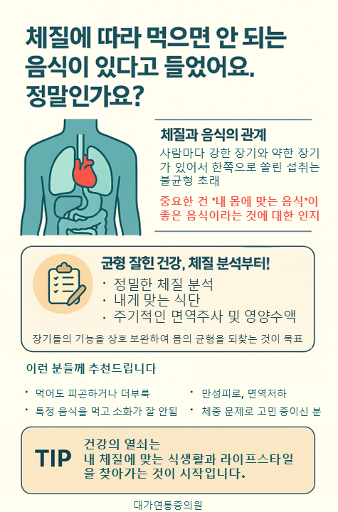 네 맞습니다. 사람은 저마다 타고난 체질과 강한 장기, 약한 장기가 다릅니다. 그에 따라 잘 맞는 음식과 피해야 할 음식도 달라진다고 봅니다. 같은 음식을 먹더라도 어떤 사람은 속이 편한데, 어떤 사람은 탈이 나는 이유가 바로 여기에 있습니다.